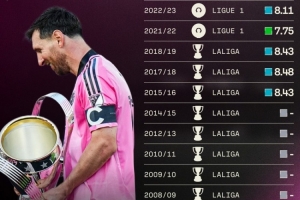 梅西职业生涯13次赢得联赛冠军:西甲10冠、法甲2冠、美职联1冠